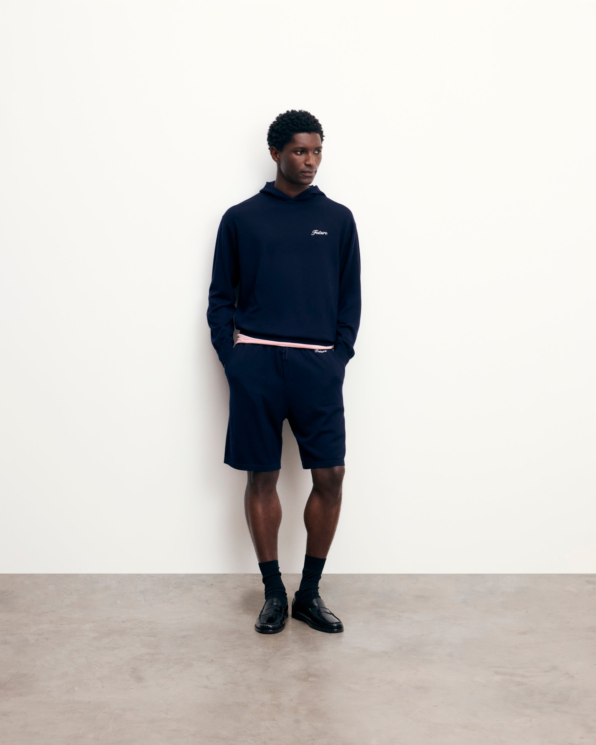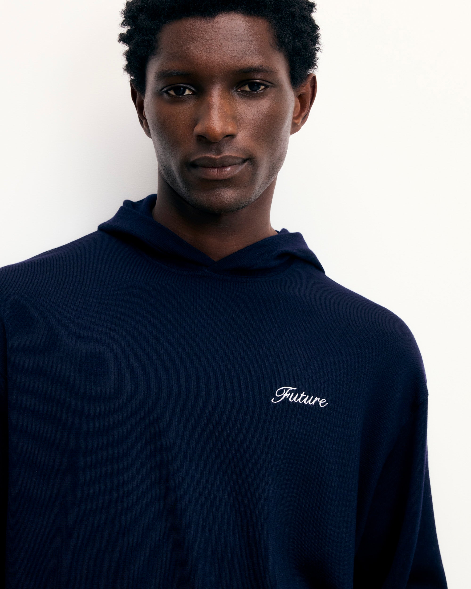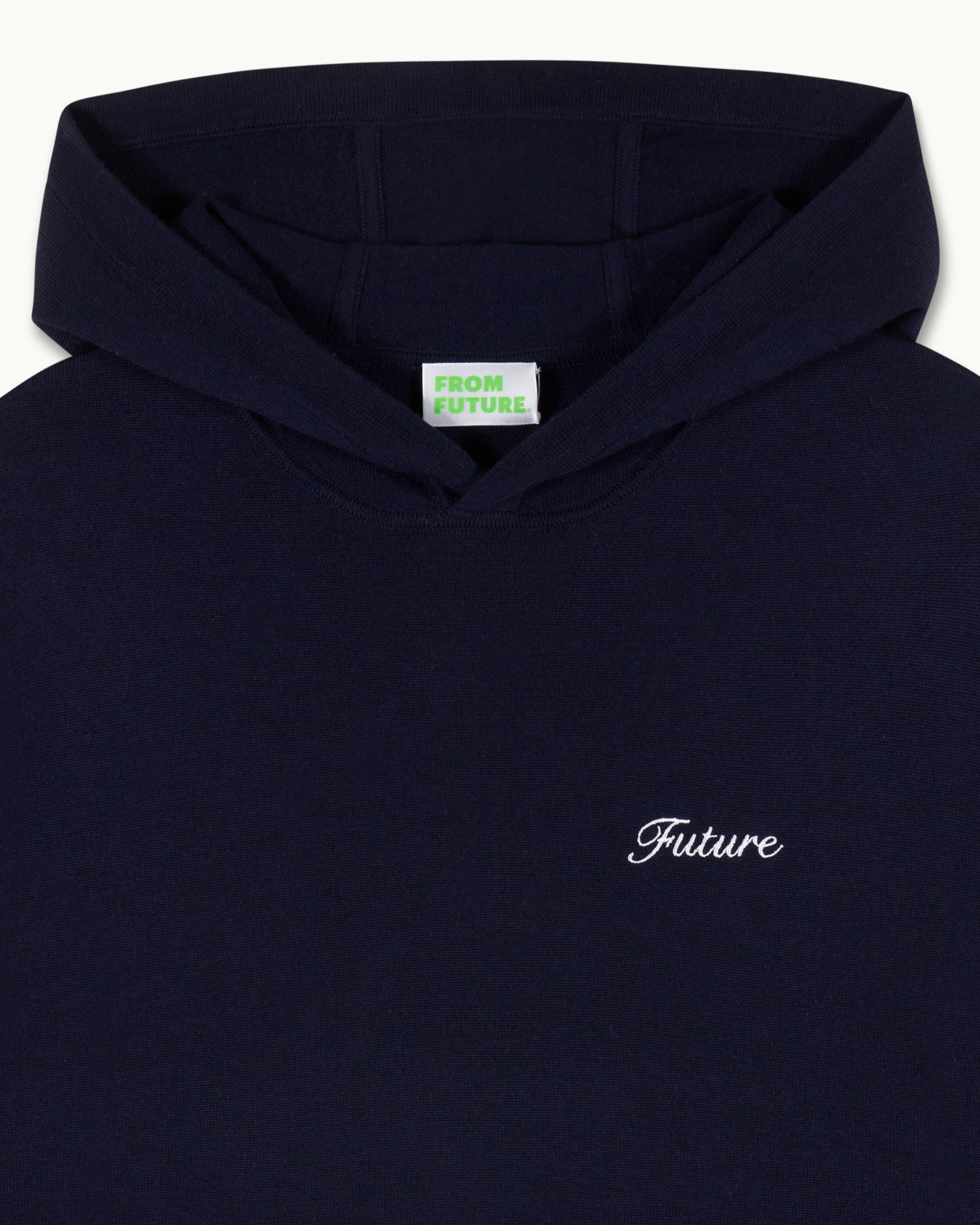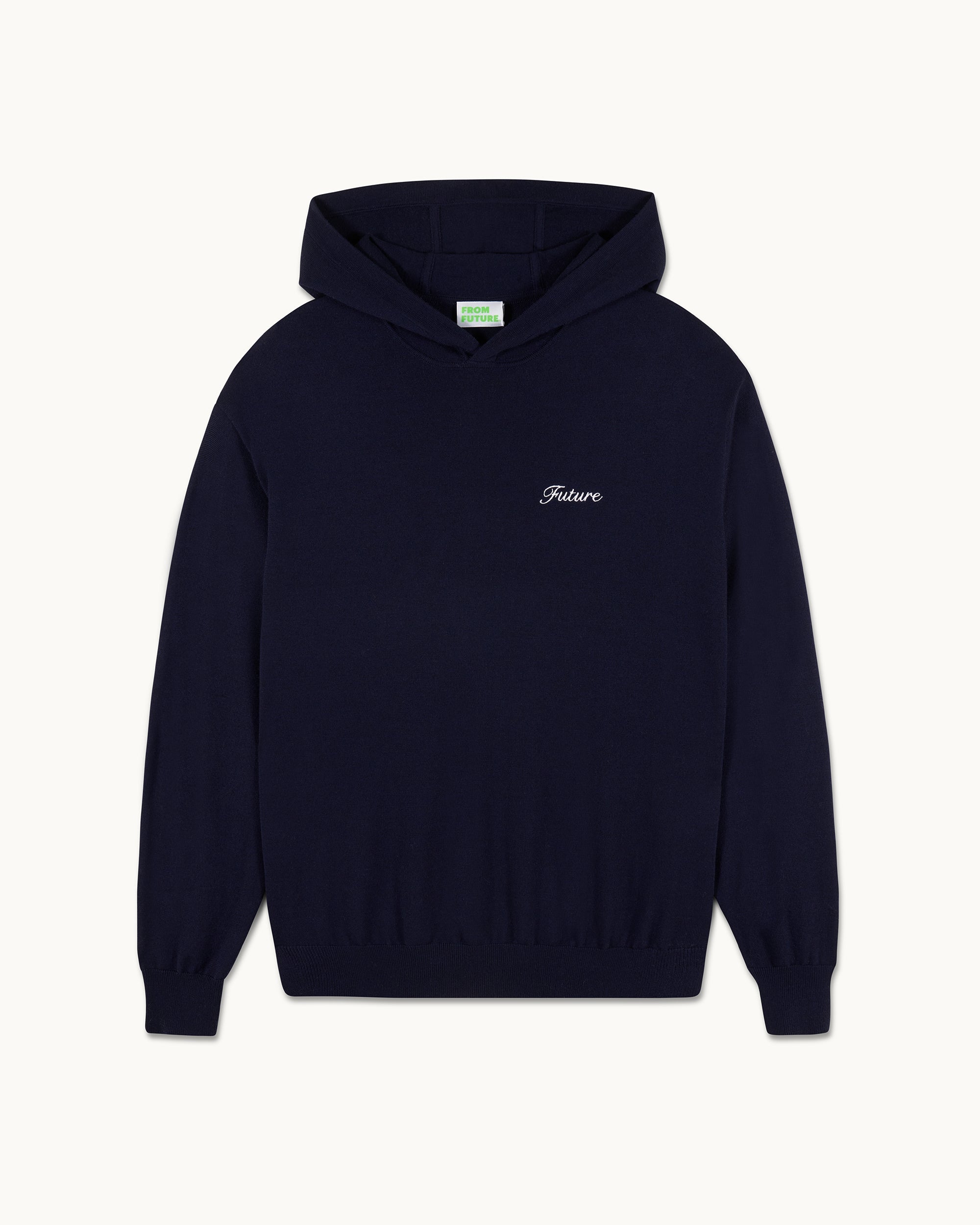 Crafted from 4-ply merino wool, this hoodie is elevated with a contrasting “Future” embroidery. It features a cozy hood, long sleeves, and ribbed edges for added comfort.