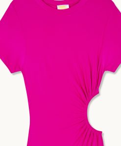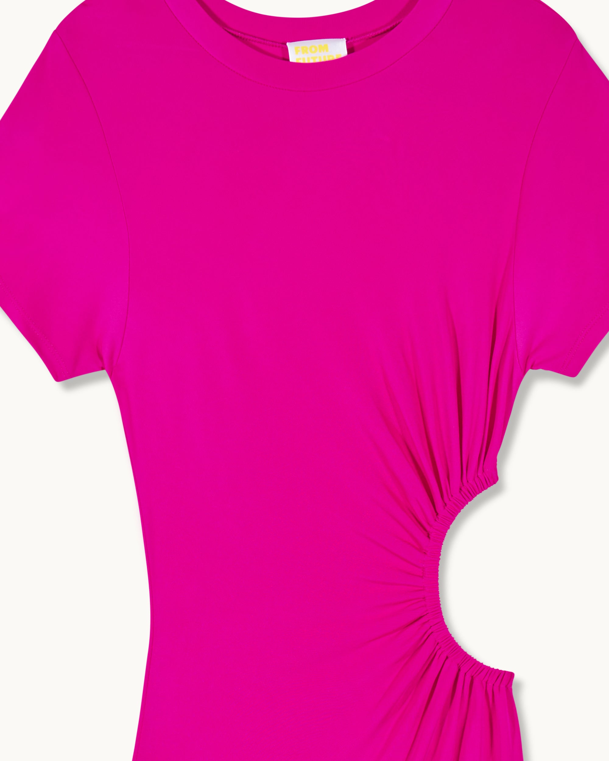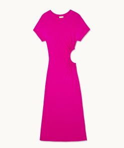 Adorned with a gathered cutout at the waist, this statement maxi dress takes you from day to night. With a classic crew neck and short sleeves, it reveals a daring side slit for a striking silhouette.