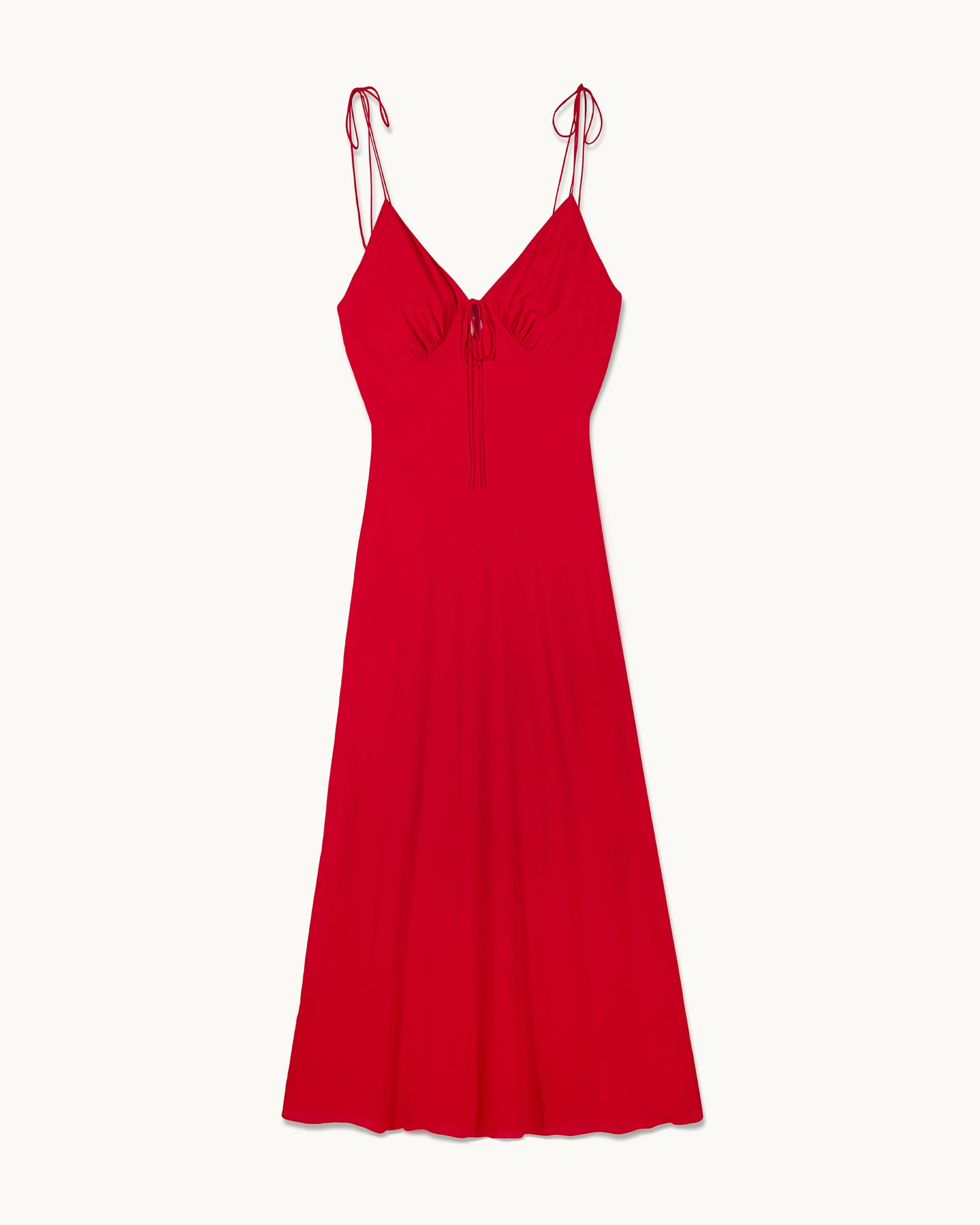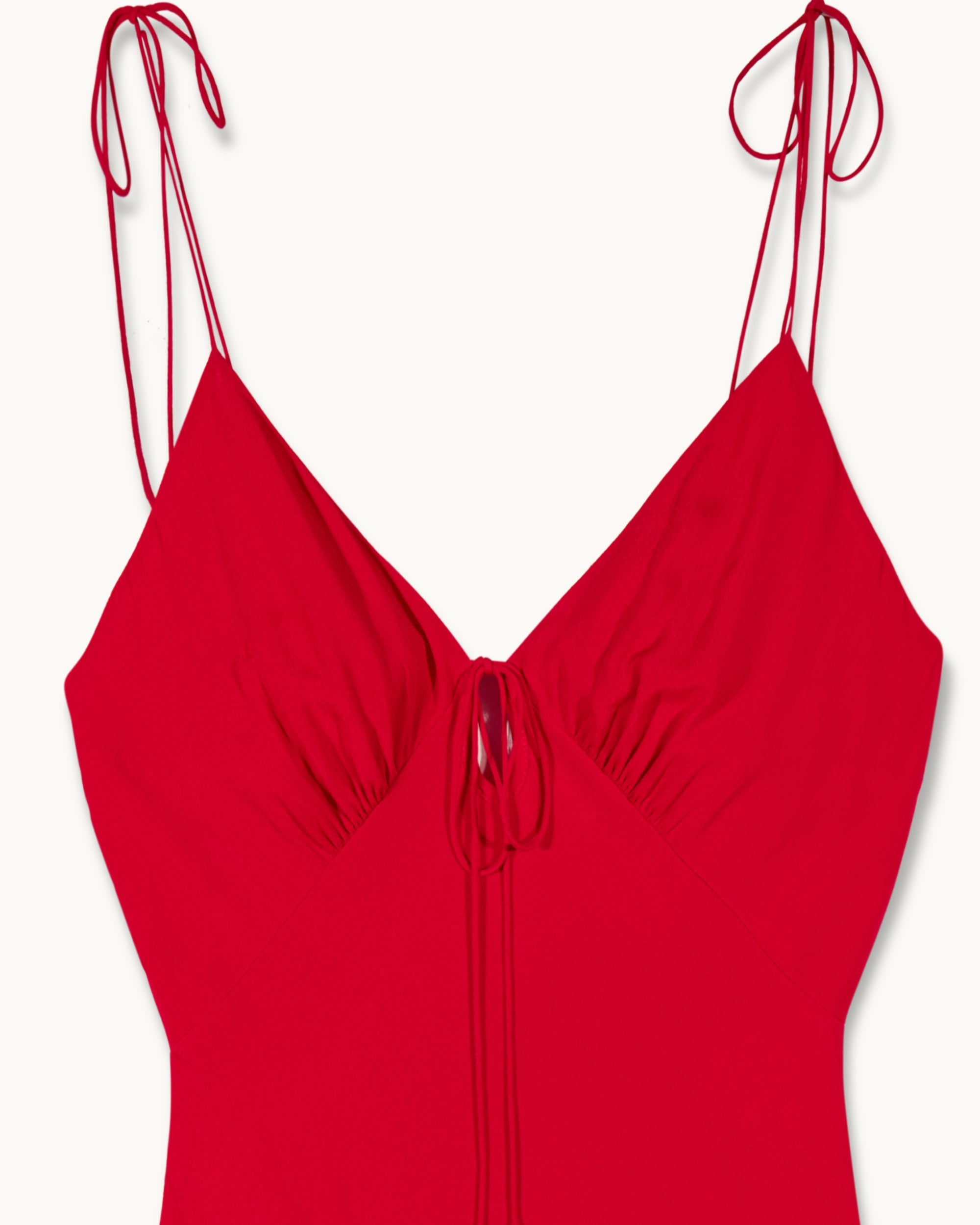 Effortlessly chic, this maxi dress features a deep V-neckline and flowing skirt. The adjustable tie straps and details adds a touch of romance. Pair with heels for a sophisticated look.