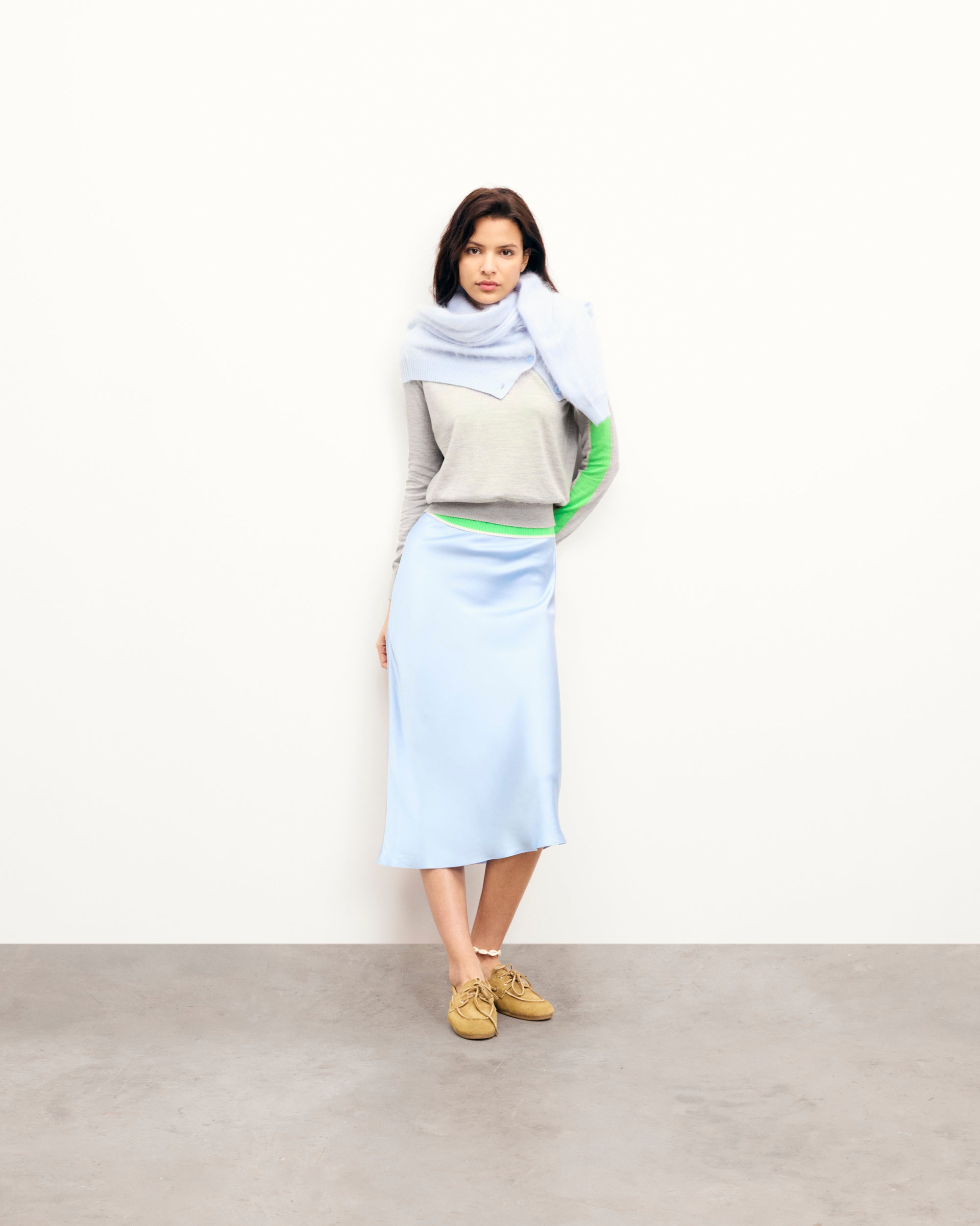 100% merino wool.Merino wool has the particularity of being temperature regulating. It is therefore ideal for wearing next to the skin in spring and summer.Hand WashFabric softener and bleaching prohibitedDo not tumble dryDry cleaning prohibitedIron at low temperature